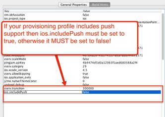 If you declare push in the provisioning profile then ios.includePush (in the build arguments) MUST be set to true, otherwise it MUST be set to false