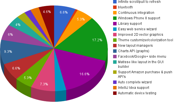 Thanks for answering our questions about what you want in Codename One 1.1, your answers were very interesting and your comments are always helpful. Before getting to the actual results I’d like to cover some of the comments made in some of the responses which I think broadcast that we need to communicate what we have better: